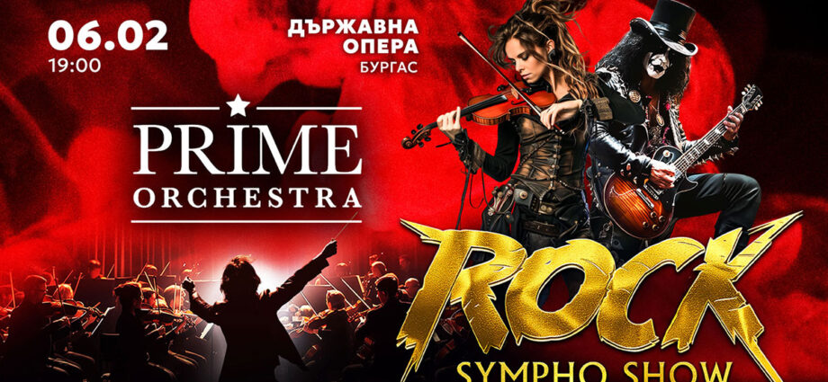 06 февруари 2026 | Петък | 19:00Държавна опера Бургас Билети: https://uconcert-bg.com/rock-sympho-show-prime-orchestra-burgas26/ Един от най-взривяващите музикални проекти на Европа се завръща! PRIME Orchestra представя третото издание на грандиозното ROCK SYMPHO SHOW, което поставя начало на юбилейната година на оркестъра и отбелязва 10 години смайващи музикални спектакли. Почувствайте мощта на рока ивиж повече