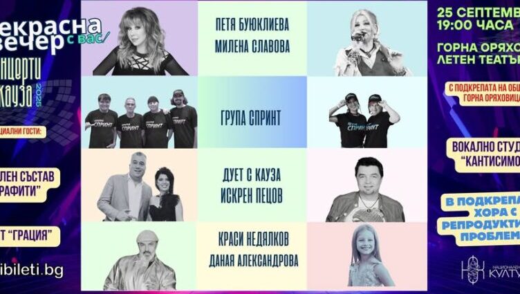Голям концерт с обществено значение ще се проведе в Летния театър на Горна Оряховица като част от националното турне „Концерти с кауза“. Събитието обединява популярни български изпълнители в подкрепа на хора с репродуктивни затруднения и млади таланти от региона.