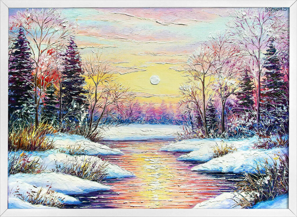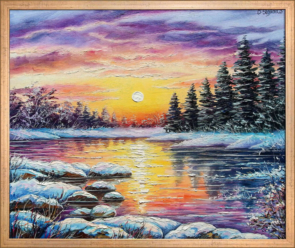 Сред творбите ще откриете и кристално чисти зимни пейзажи, в които залезът се прелива върху замръзнали езера. Всеки щрих носи усещане за спокойствие, застинал миг и неподправена красота.