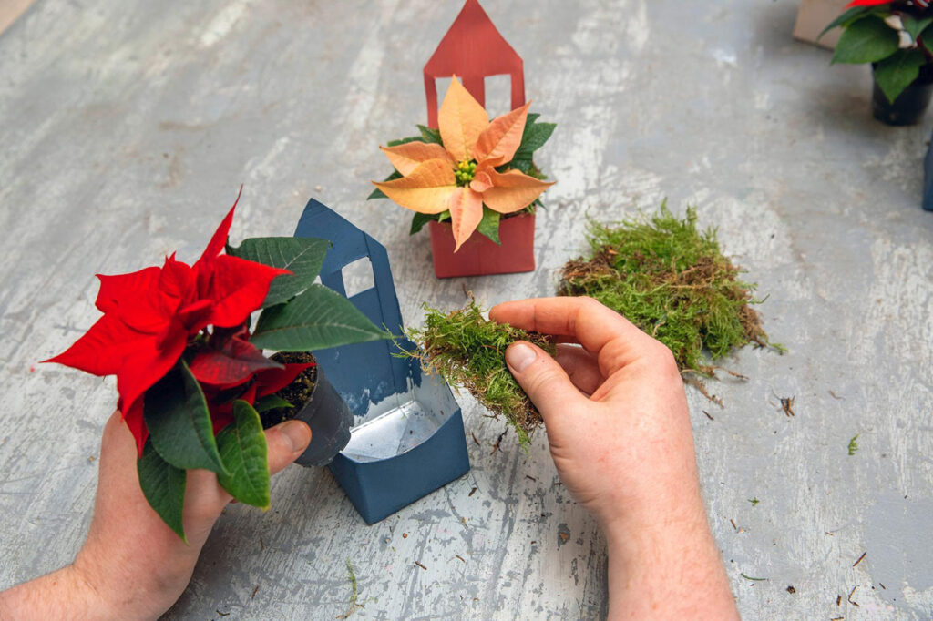 Стъпка 4: При отворените къщички покрийте дъното с мъх – той ще задържи растенията стабилно и ще придаде естествен вид. Поставете мини коледните звезди в саксиите им и ги обградете с още мъх, за да прикриете саксиите.
