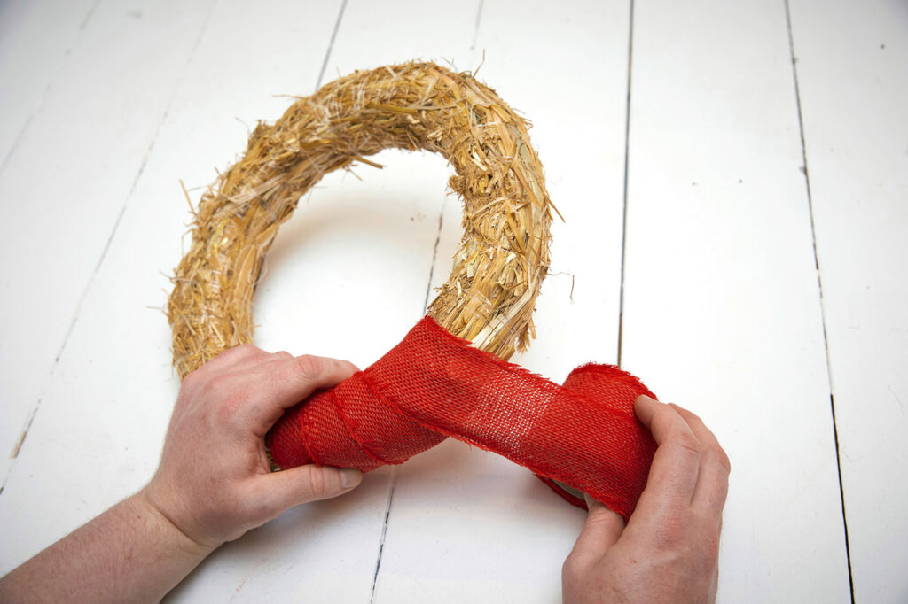 Необходими материали: купа, сламен (или хартиен) венец със същия диаметър като купата, широка червена панделка, пет или шест мини коледни звезди, шипки (Rosa multiflora), декоративни клонки с ябълки (Malus floribunda), декоративна тел, пистолет за топъл силикон и силиконови пръчки, коледни топки в различни размери.