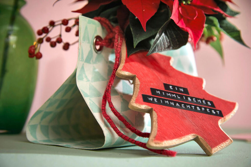 Ще са ви необходими: парче тапет (поне 30 × 30 см, според размера на торбичката), линия и молив, ножица или макетен нож, перфоратор, две метални капси и инструмент за поставяне на капси (по желание), шнур или панделка, саксийна коледна звезда в кашпа, самозалепваща лента, декоративни дървени етикети (например във формата на елха или звезда), клонки от шипка (Rosa multiflora) или други естествени декоративни материали.