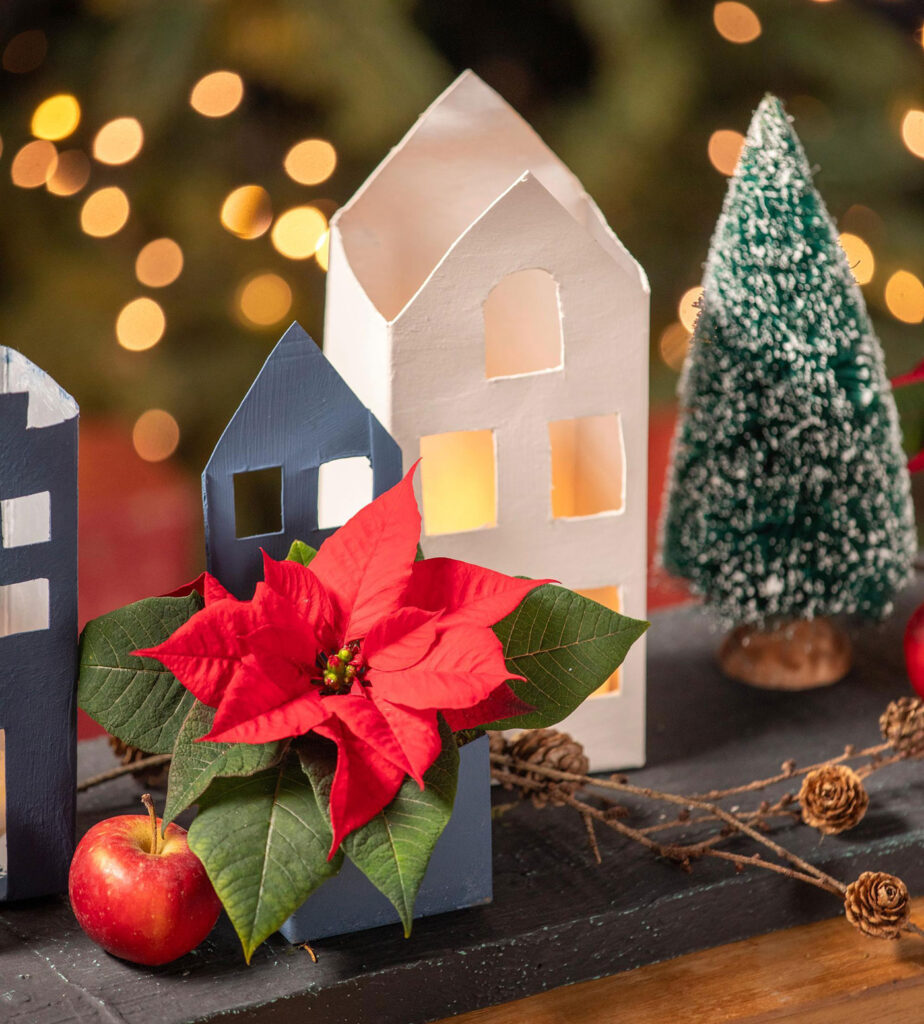 Това вълшебно коледно селце е креативна аранжировка, особено подходяща за семейства с деца. Ръчно изработени къщички от празни картонени опаковки (например от натурален сок) и яркочервени мини коледни звезди превръщат тази флорална композиция в празнична декорация, която радва както малки, така и големи.