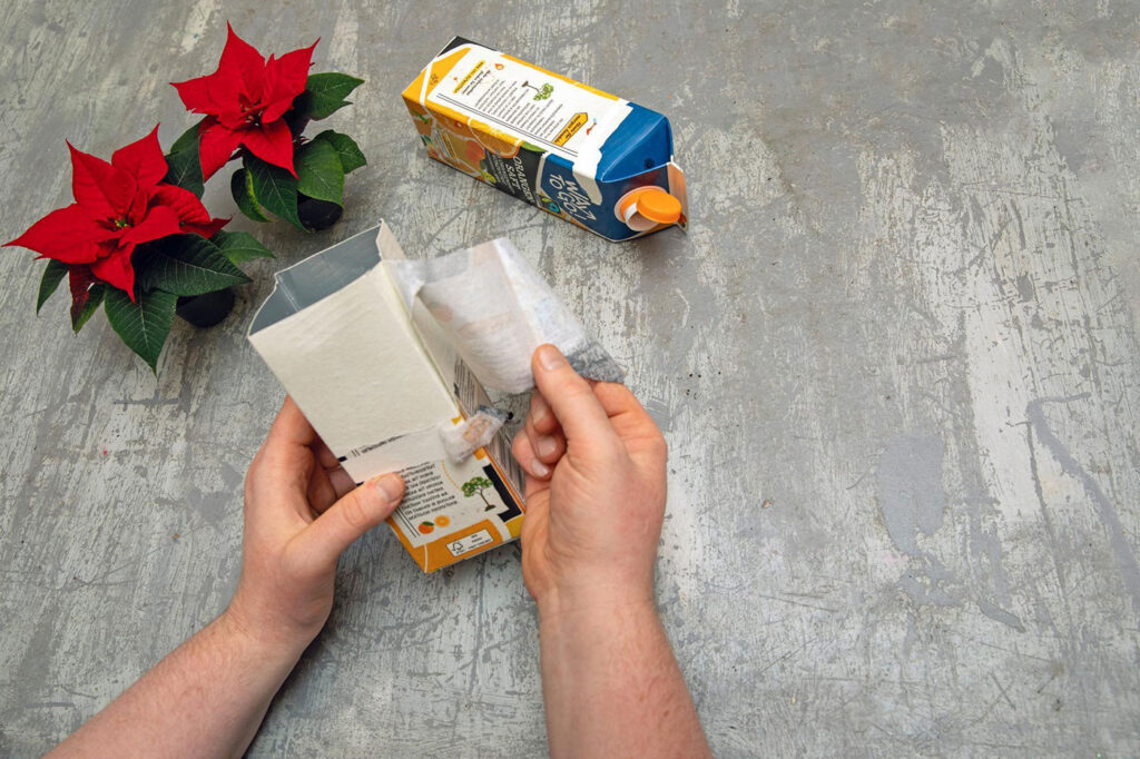 Стъпка 1: Измийте добре празните опаковки и ги оставете да изсъхнат. Отрежете горната част с макетен нож или ножица, след което внимателно отстранете отпечатания външен слой, за да получите неутрална основа за декорацията.
