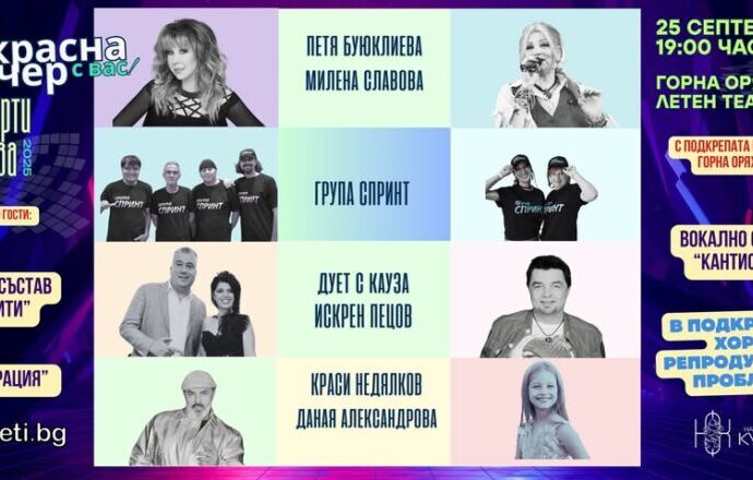 Голям концерт с обществено значение ще се проведе в Летния театър на Горна Оряховица като част от националното турне „Концерти с кауза“. Събитието обединява популярни български изпълнители в подкрепа на хора с репродуктивни затруднения и млади таланти от региона. На сцената ще се изявят Петя Буюклиева, Милена Славова, Искрен Пецов,виж повече